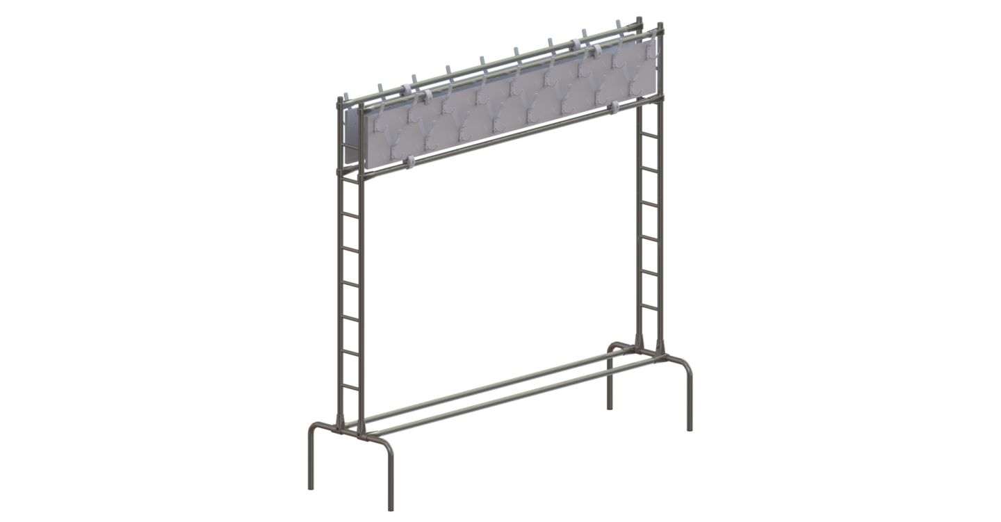 колонна - 2 шт., п-образный профиль - 2 шт., перемычка - 6 шт., держатель панели - 8 шт., заглушка - 4 шт., панель - 2 шт., соединитель 2-х труб - 16 шт., крючок - 34 шт., опора пластиковая - 4 шт., ключ шестигранный - 1 шт. |