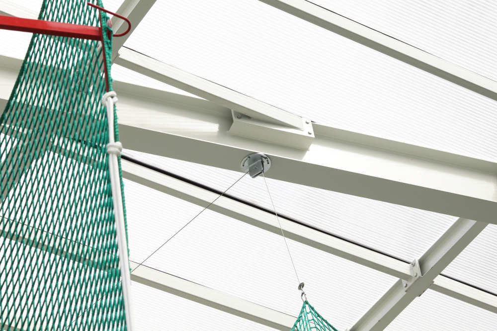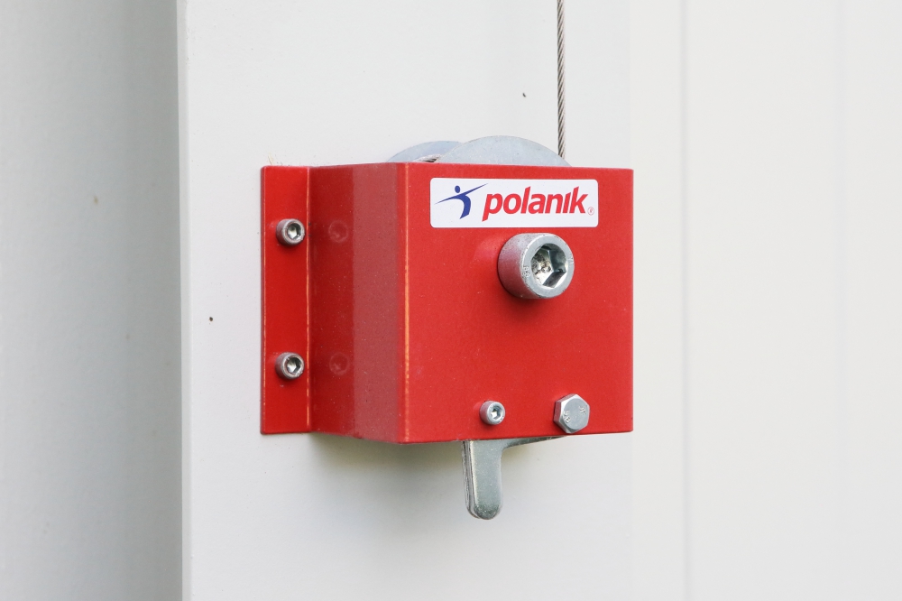 сетка подвешивается к потолку на блоках; механизм подъема сетки самоблокирующийся с помощью рукояток |
