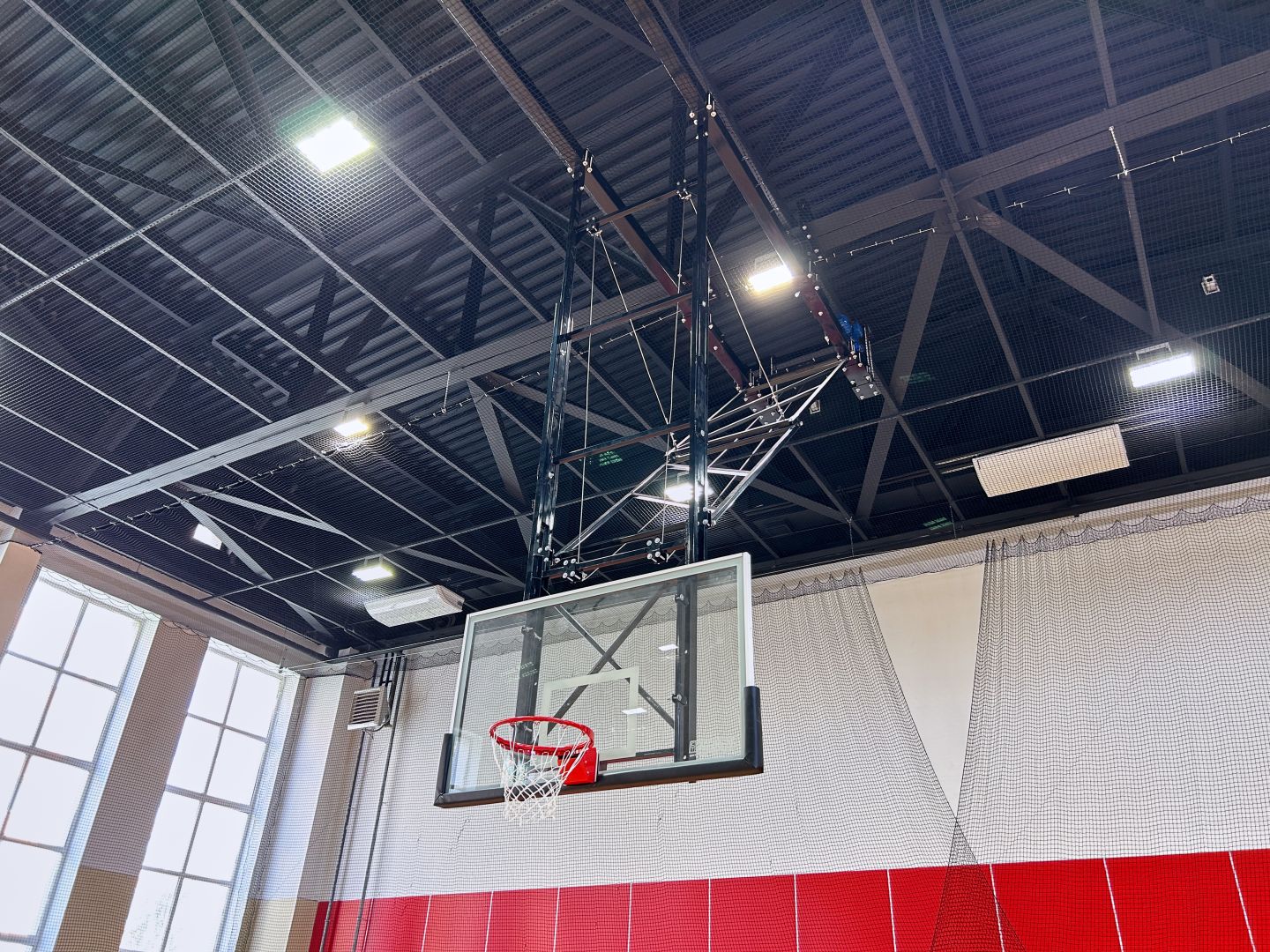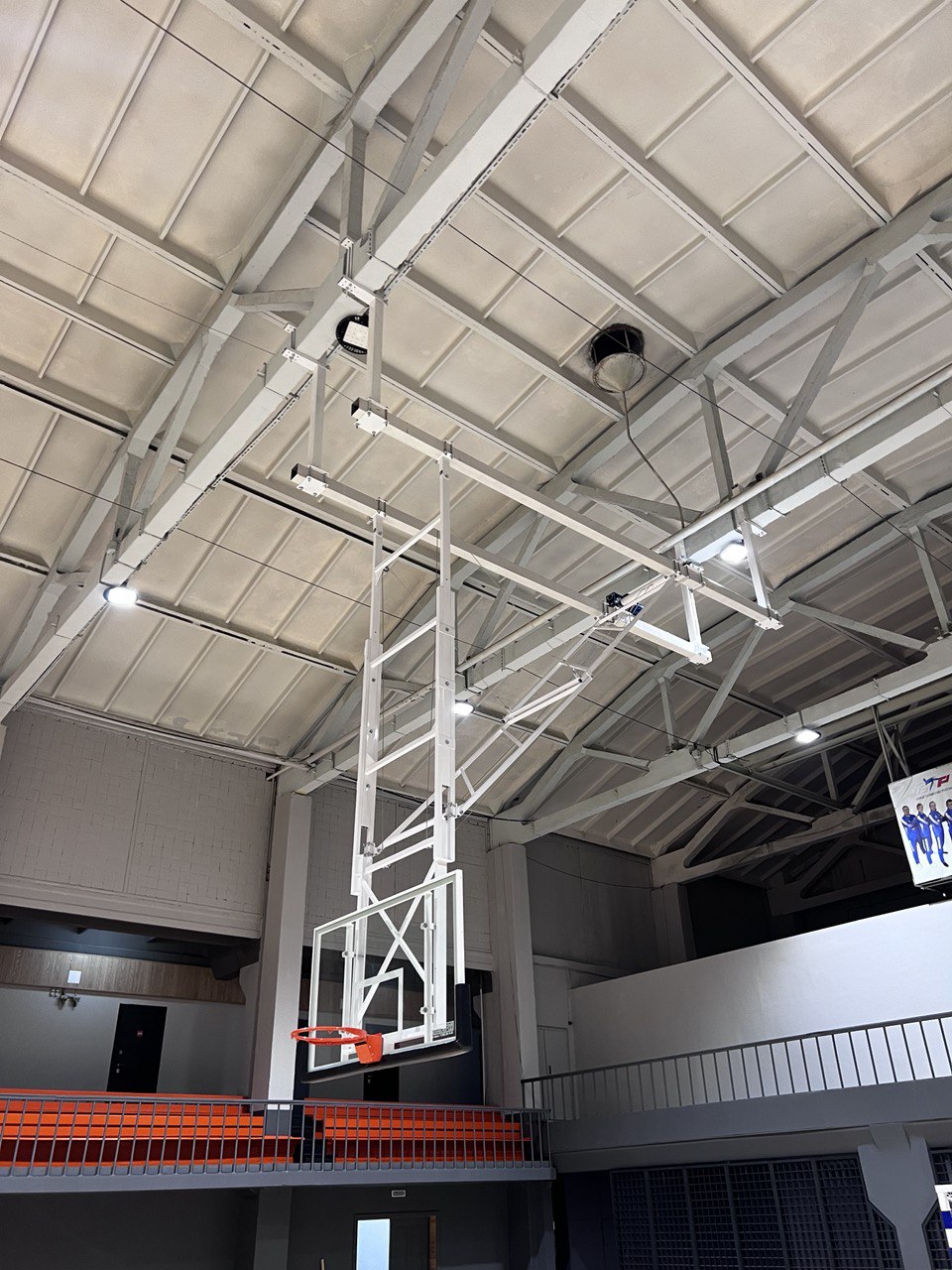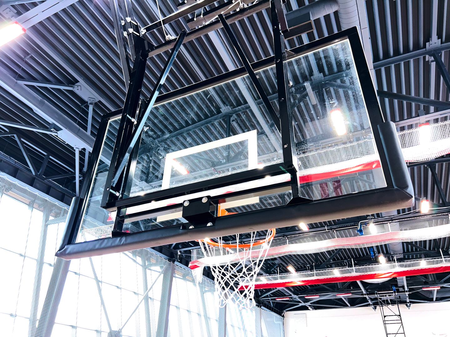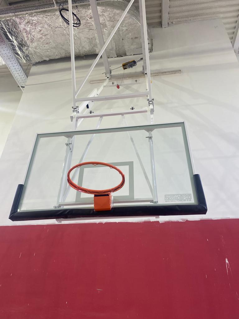 Щит баскетбольный со складной фермой на электроприводе (к-т: ферма потолочная, щит из закаленного стекла 10мм, протектор, аморт. кольцо, сетка) СТ-191