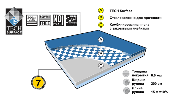 • Покрытие состоит из трех слоев: пена с закрытыми ячейками, стекловолокно, дающее прочность и PUR Surface.