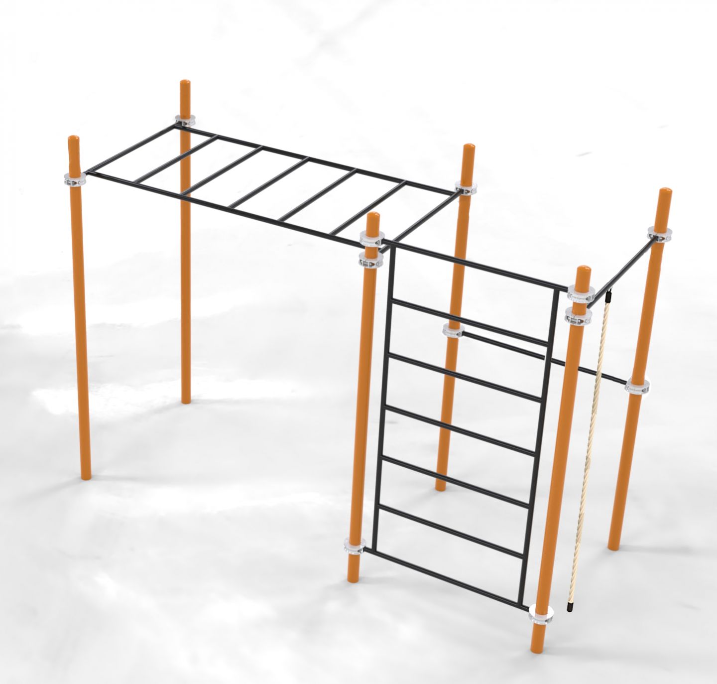 классический турник для подтягивания – 1 шт.; перекладина (турник) для подтягивания – 1 шт.; шведская стенка – 1 шт.; рукоход – 1 шт.; 6 опорных вертикальных столбов длиной 33000 мм – 6 шт.; 12 хомутов; канат для лазания с креплением |