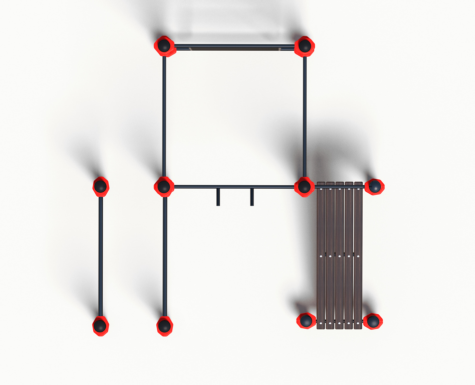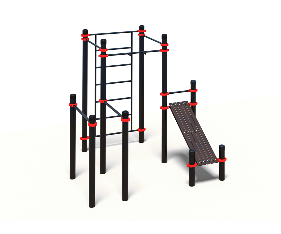 - Имеются перекладины для подтягиваний разными хватами (классический и «молоток»), наклонная скамейка, гимнастическая стенка и параллельные брусья.
