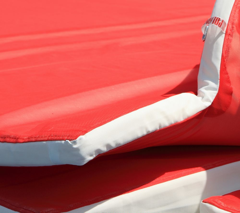правильное поглощение энергии и удобная для прыгающего поверхность, сегменты скреплены между собой ремнями из жаккардовой ленты, оснащенными металлическими самоблокирующимися пряжками, конвертная строчка делает соединение очень прочным |