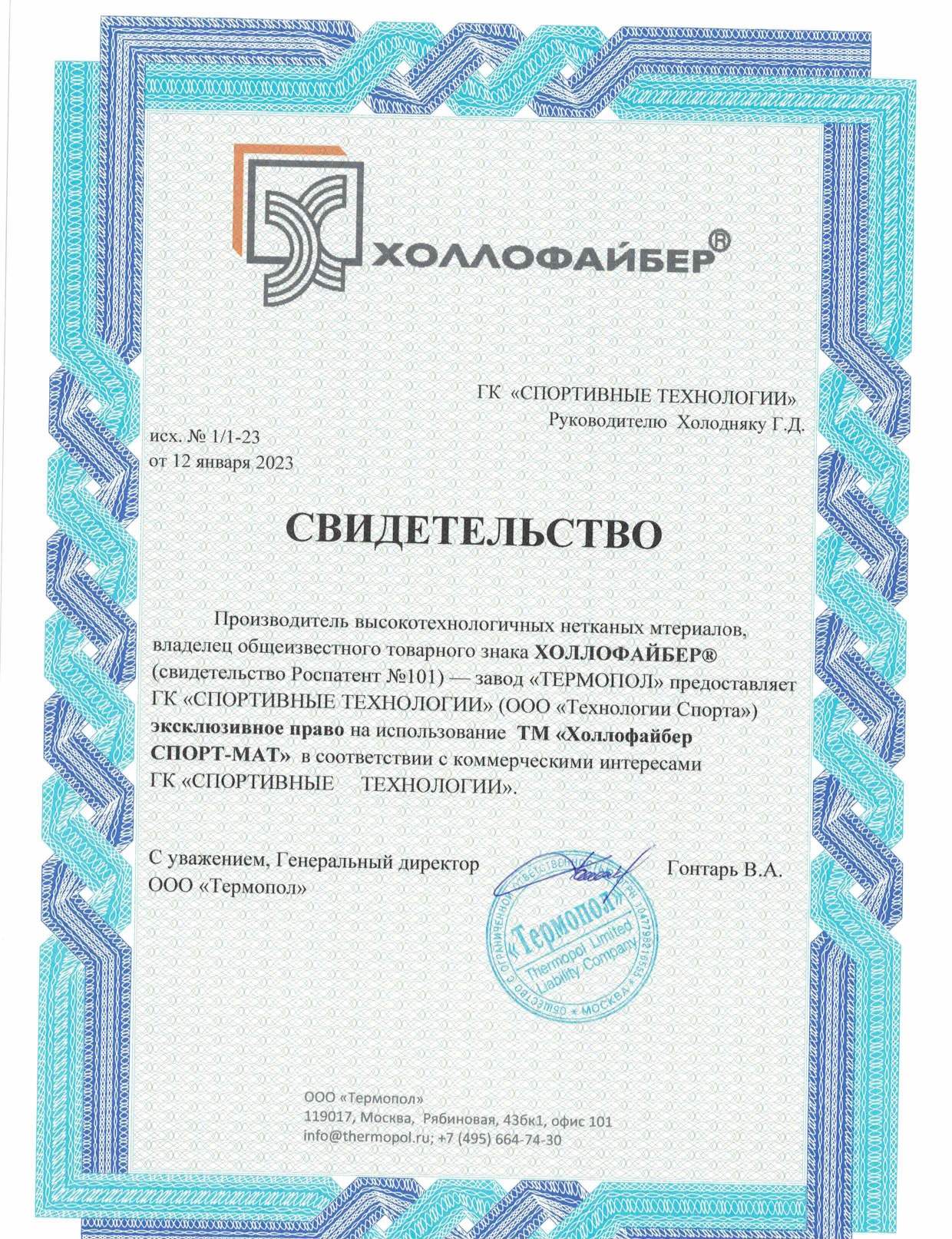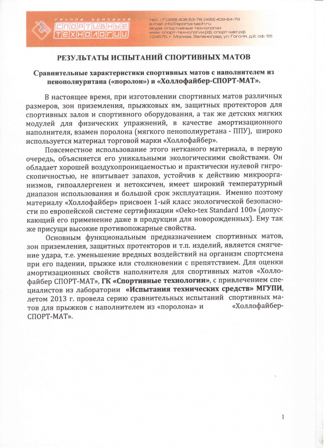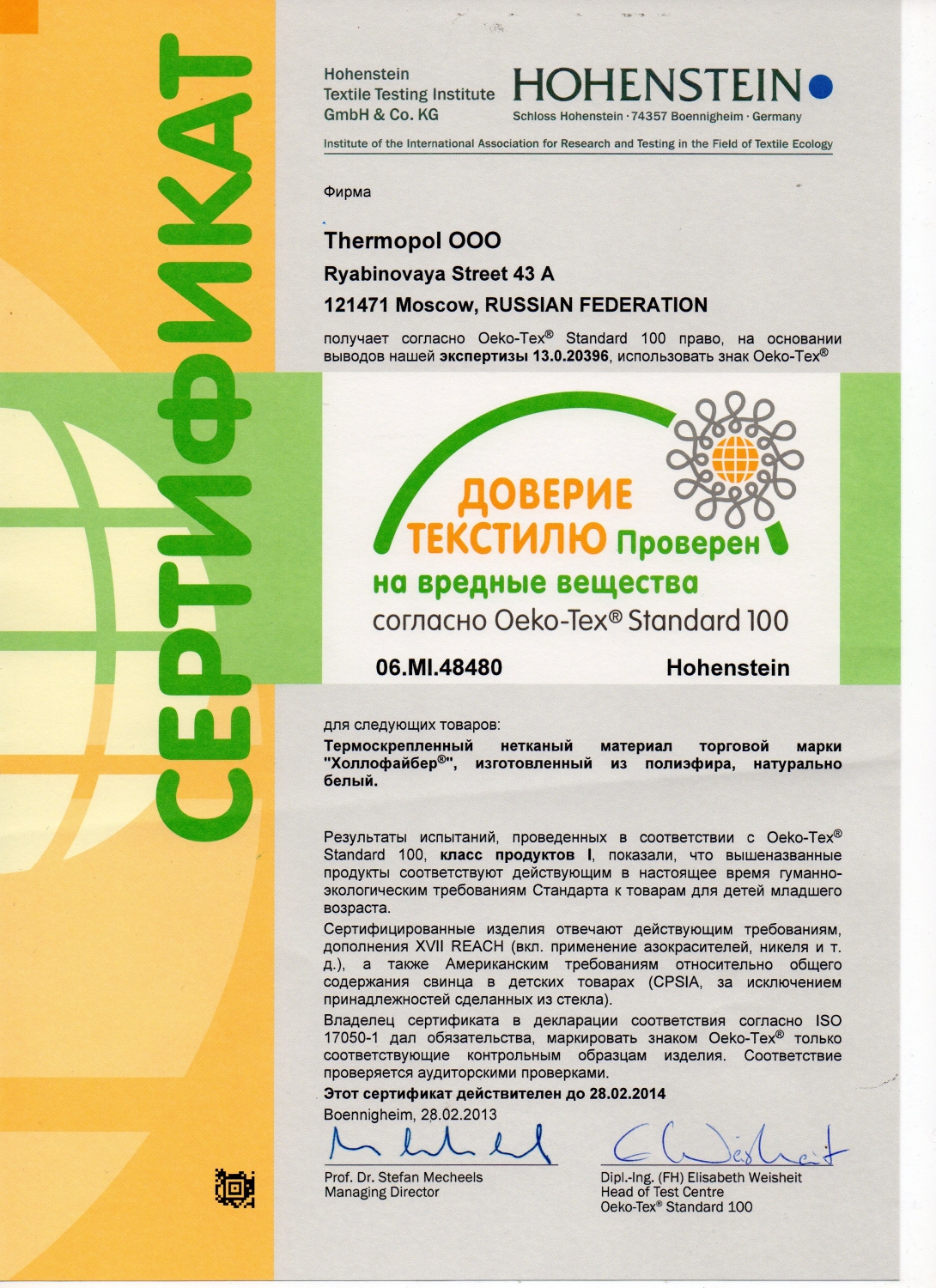 Наша компания является эксклюзивным сублицензиатом торговой марки «Холлофайбер СПОРТ-МАТ». Мы предоставляем Сертификат Соответствия на производимую нами продукцию.