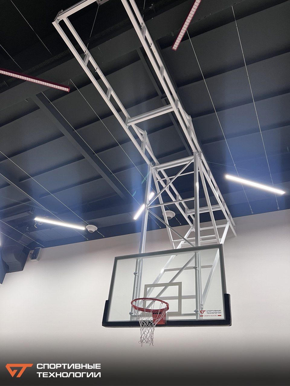 Здесь использовалось наше стандартное решение – баскетбольный щит со стационарной потолочной фермой СТ-333. Это один из вариантов из нашей линейки баскетбольных ферм, которая включает 17 моделей: настенные и потолочные, складные и стационарные, на ручном управлении и на электроприводе.